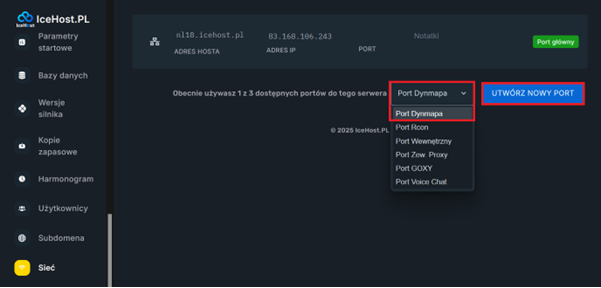 - Dodaj nowy port, wybierając opcję Port Dynmap, a następnie Utwórz nowy port